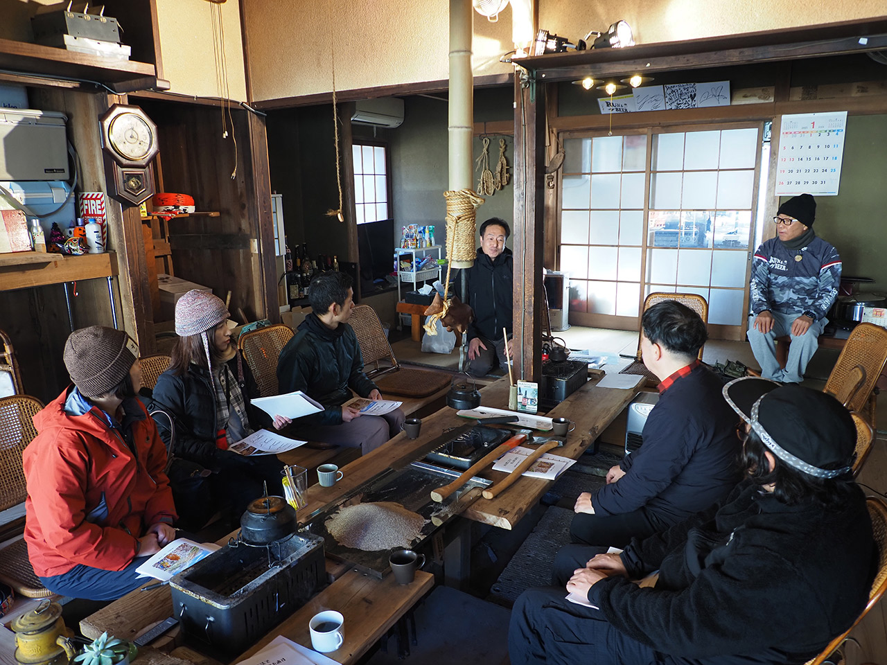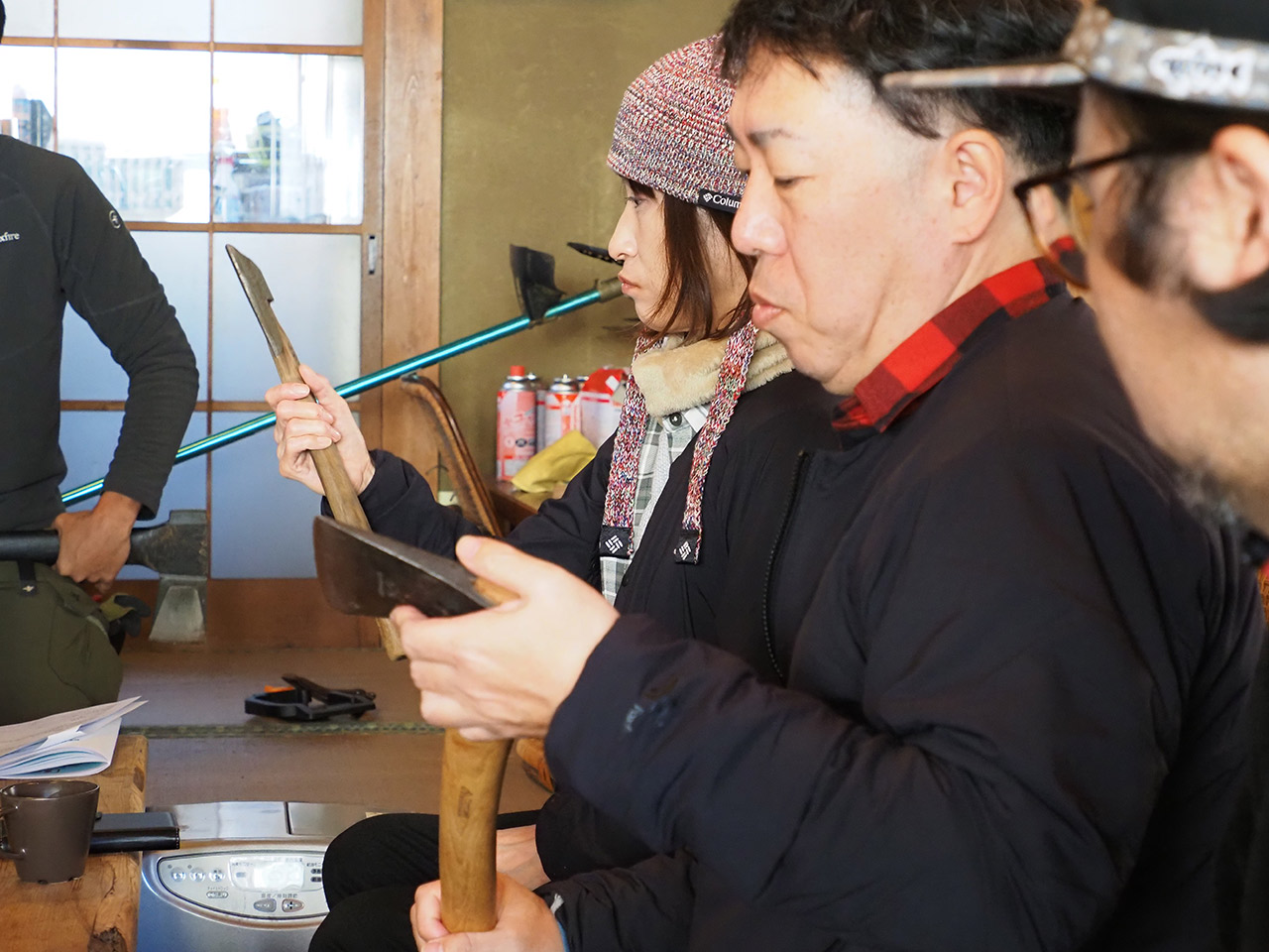 今回集まったのはFoxfire直営店の店長達5人。皆、日頃から山には登っていますが、トレイル整備は初めて。また女性店長達は道具を触るのも初めて。そこでまずは、登山道についての基礎的な知識や道具の説明を、座学でレクチャーして頂きました。